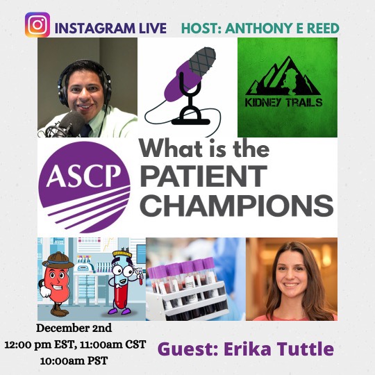 Mark you calendar for December the 2nd at 12:00pm EST, 11:00pm CST, 10:00pm EST. Where our very own Anthony Reed will sit down and talk with Erika Tuttle, MSHR, SHRM-CP about ASCP Patient Champion program on the Kidney Trails Instagram live.
